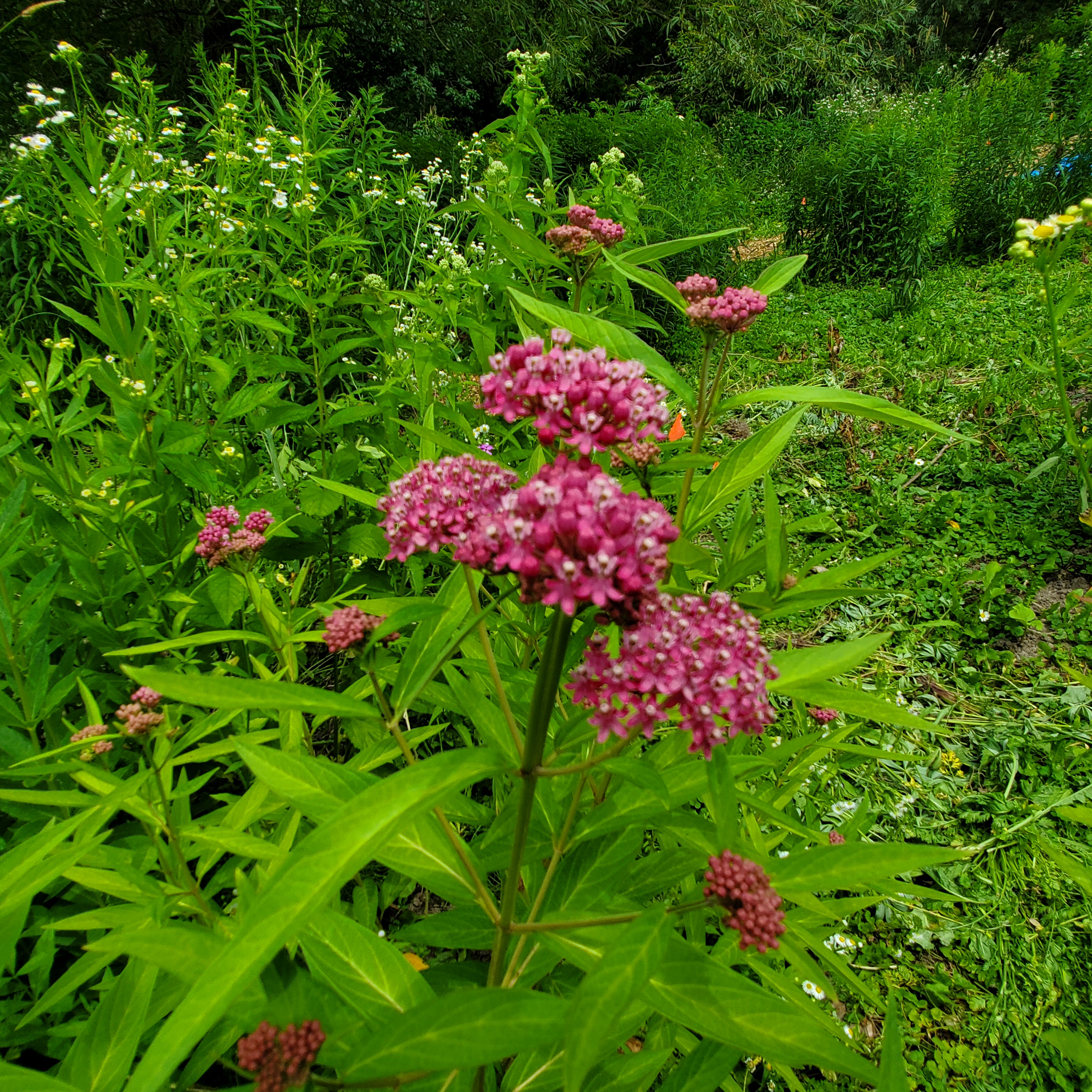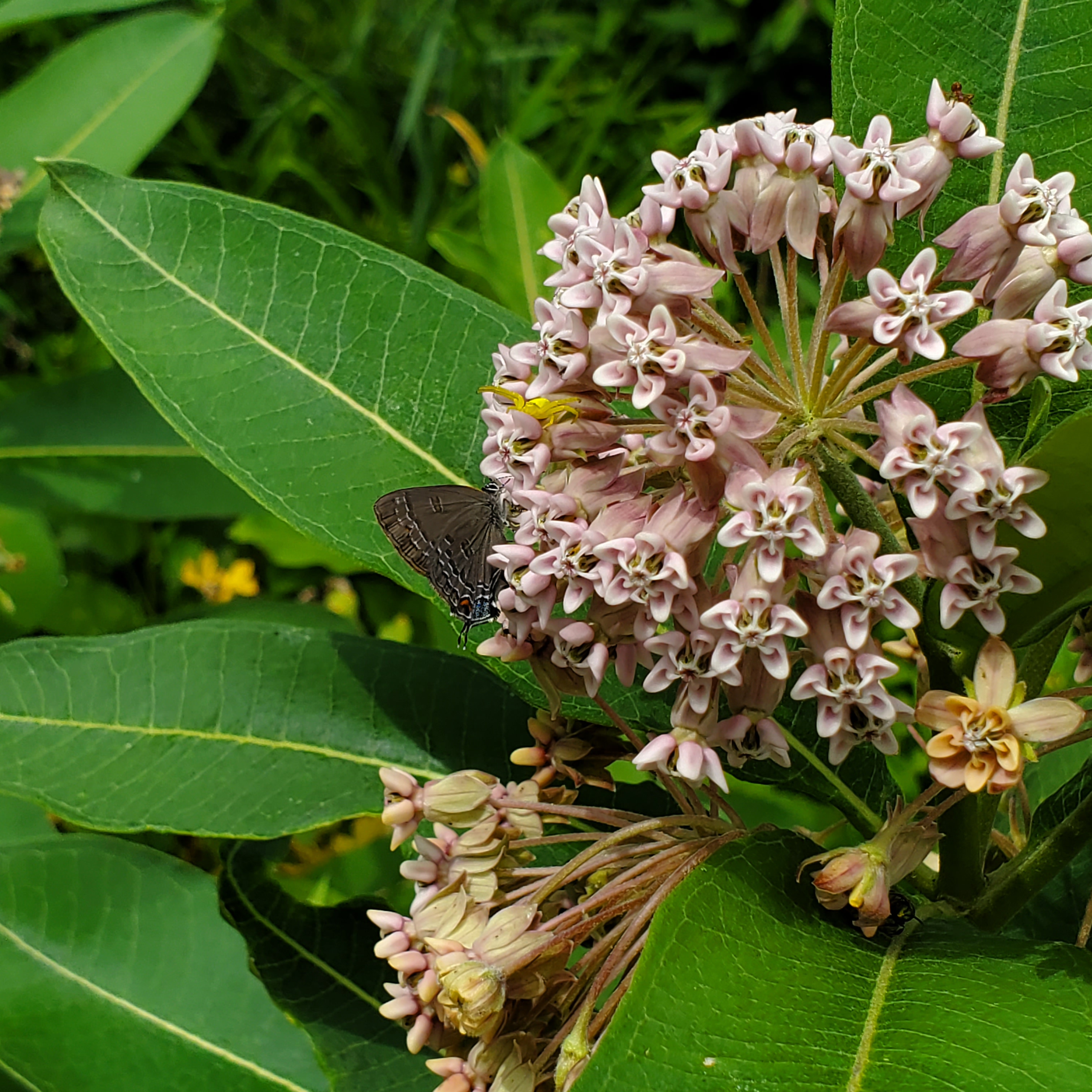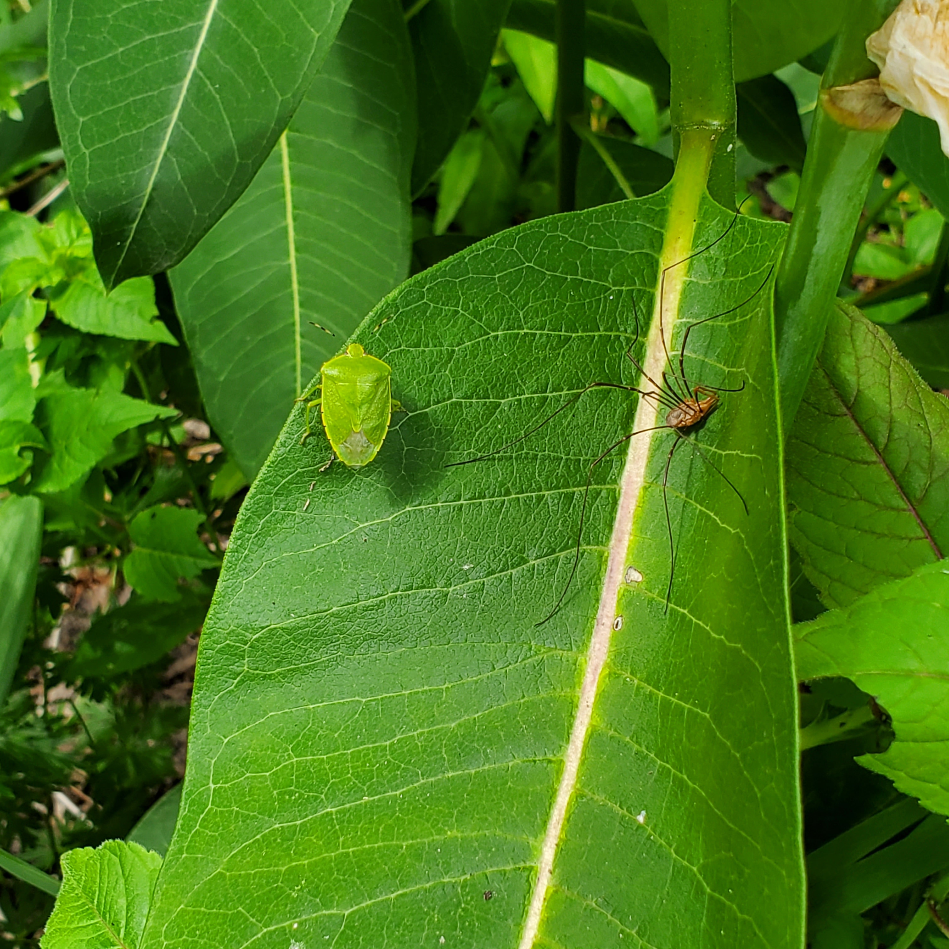 I’ll add Latin names later: from top right, clockwise: Scarlet Beebalm (Monarda didyma), Swamp Milkweed (Asclepias incarnata), a Blue butterfly and yellow crab spider on Common Milkweed (Asclepias syriaca), Ironweed, about to bloom; Virginia mountain-mint, about to bloom; Hoary Vervain, grown from seeds collected in the amazing native gardens at University College, University of Toronto; White Vervain, in foreground, with Burr Oak, Common Milkweed and more behind it; centre, a large stink bug and “daddy-longlegs” on a Common Milkweed leaf.