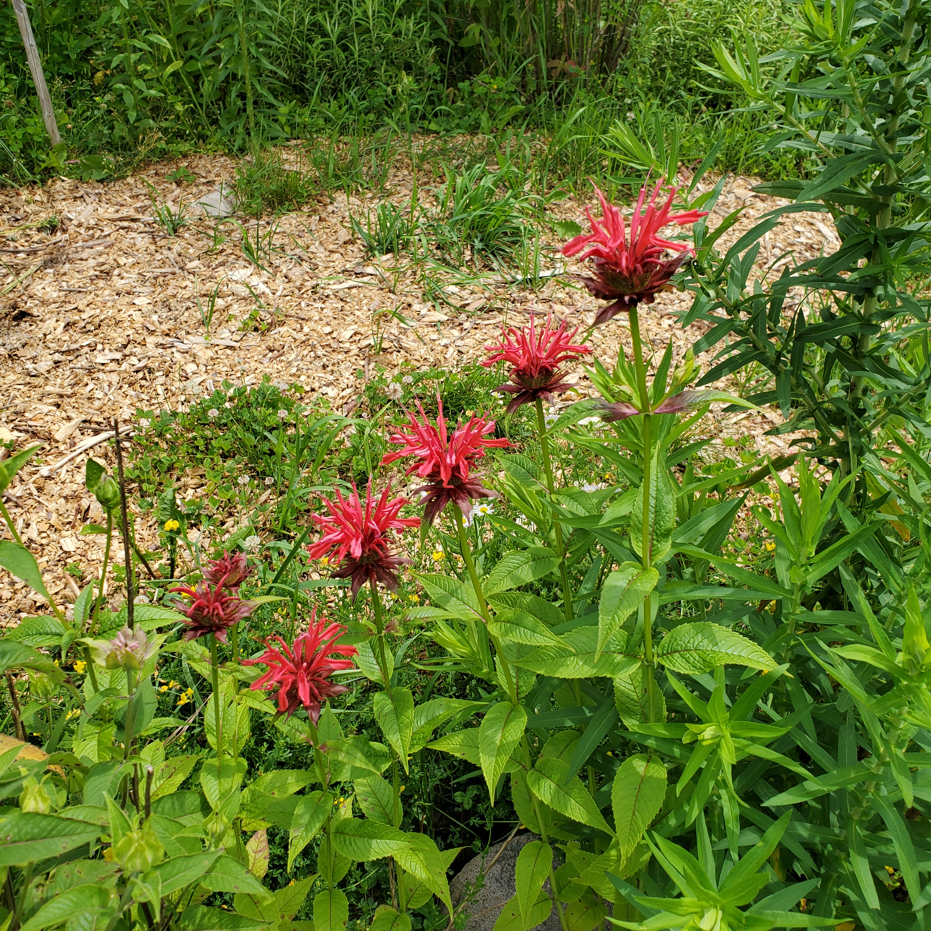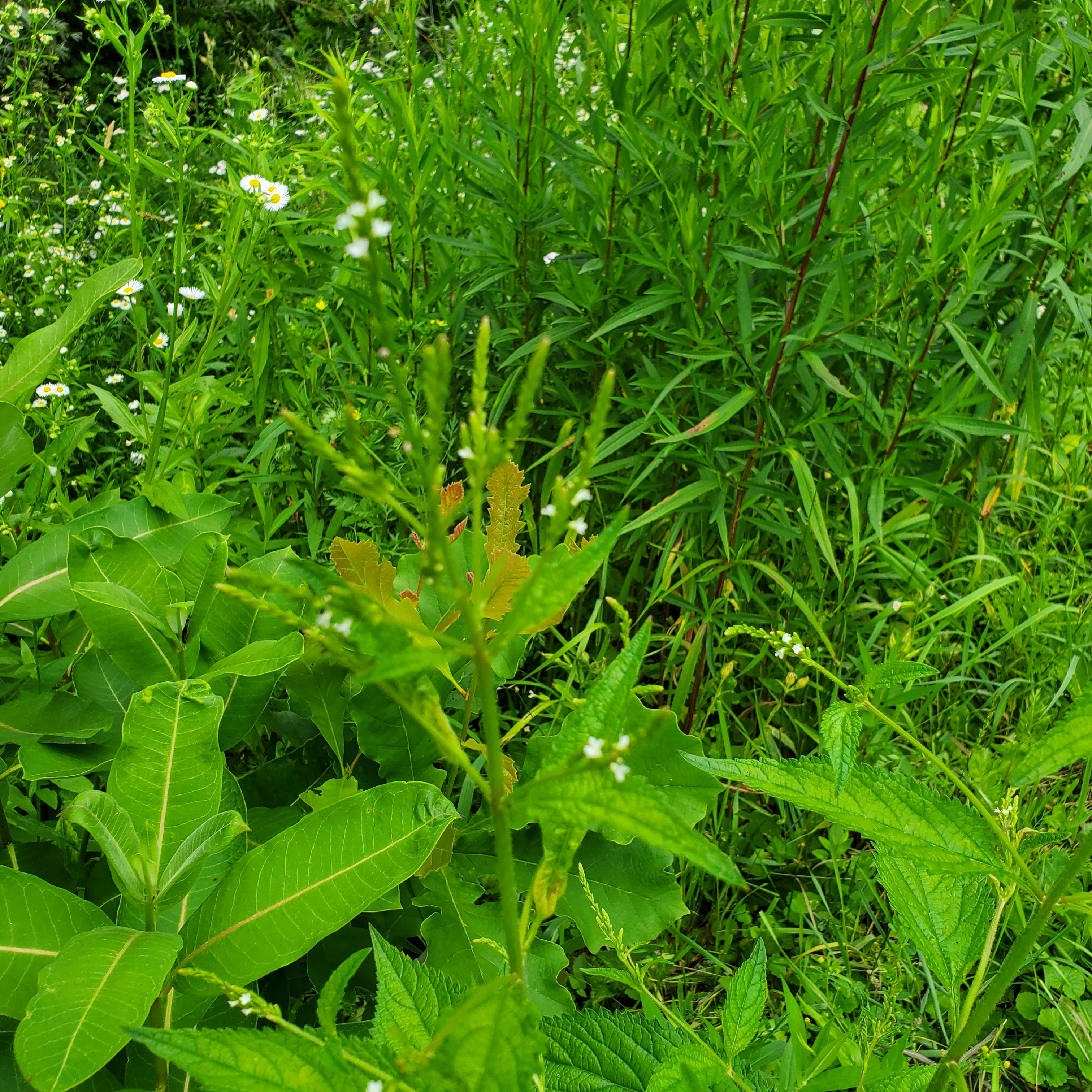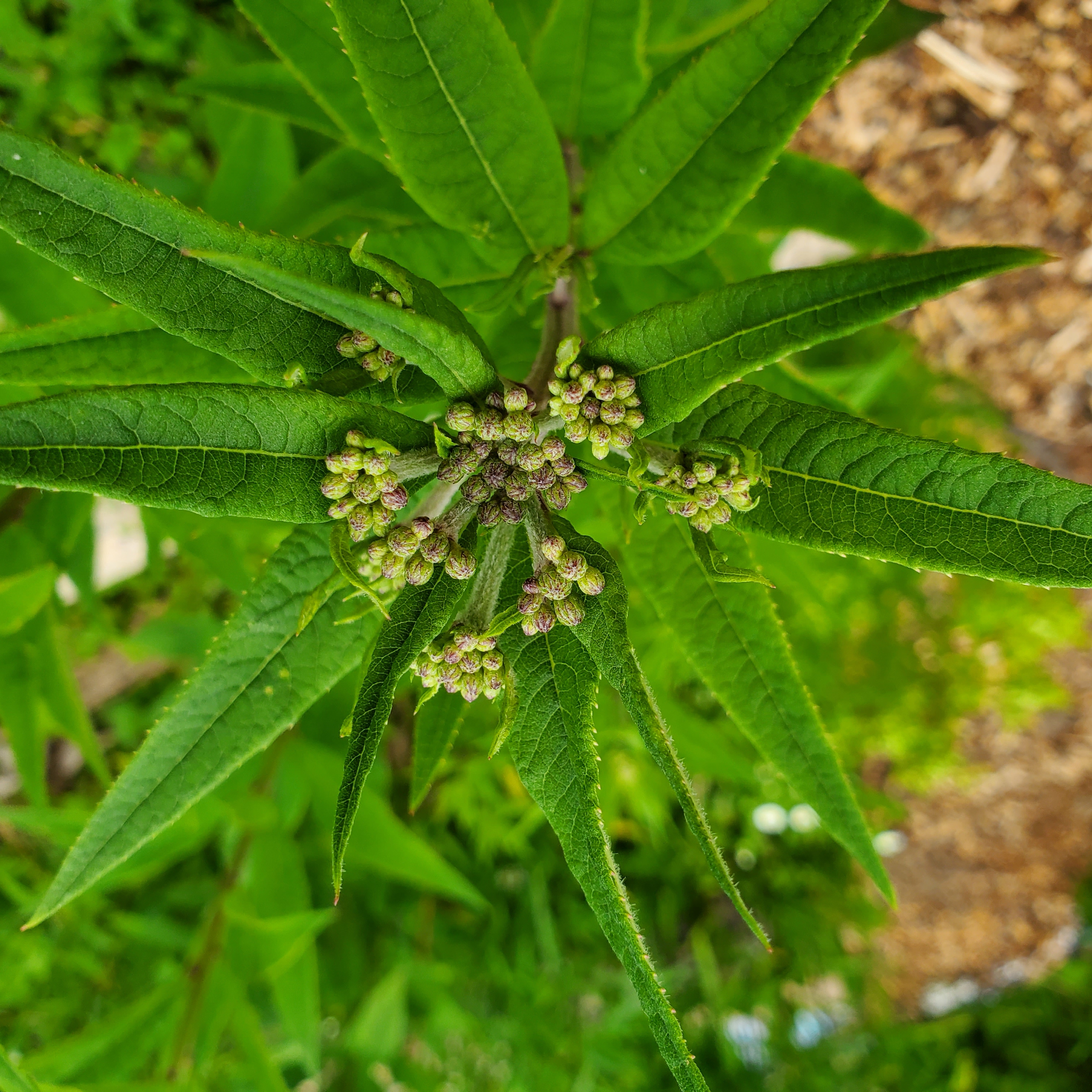 I’ll add Latin names later: from top right, clockwise: Scarlet Beebalm (Monarda didyma), Swamp Milkweed (Asclepias incarnata), a Blue butterfly and yellow crab spider on Common Milkweed (Asclepias syriaca), Ironweed, about to bloom; Virginia mountain-mint, about to bloom; Hoary Vervain, grown from seeds collected in the amazing native gardens at University College, University of Toronto; White Vervain, in foreground, with Burr Oak, Common Milkweed and more behind it; centre, a large stink bug and “daddy-longlegs” on a Common Milkweed leaf.