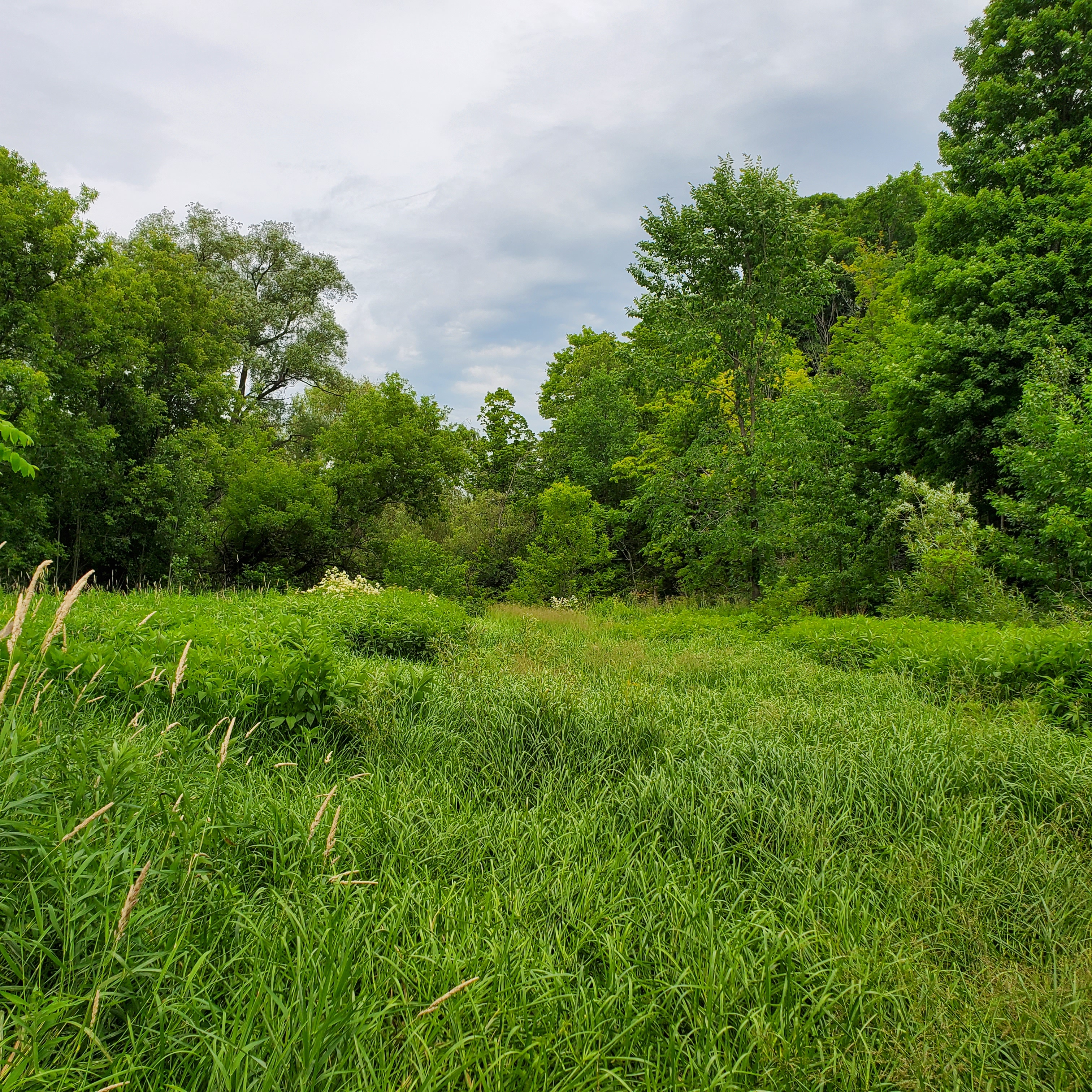 After a very warm, rainy June, the wet meadow is greener than it’s been in our 3 summers here so far. Lots of white flowers (naturally growing, i.e. not planted) are blooming right now; for example, above, water hemlock, tall meadow rue, Canadian elderberry and Canada anemone. Meanwhile, the native plants I’ve been planting are really taking off (below):